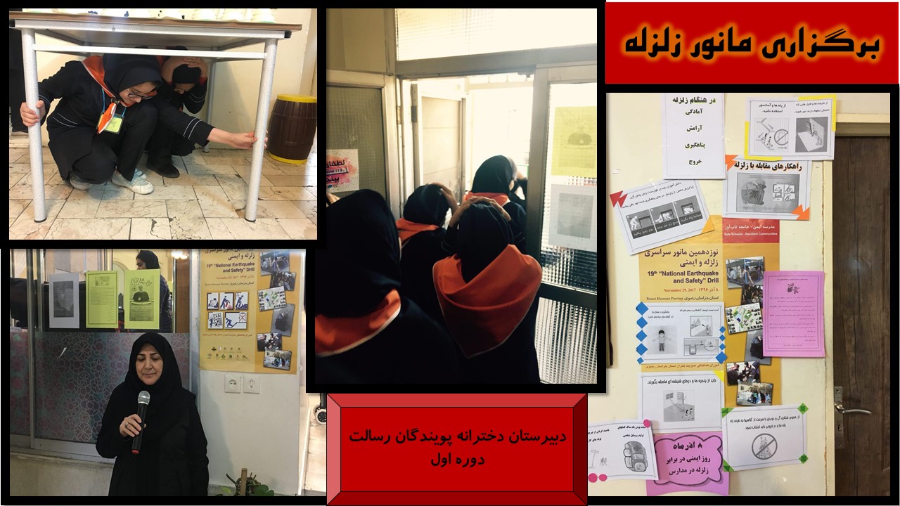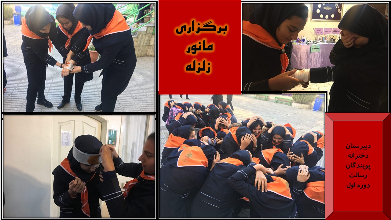 در روز چهارشنبه مورخ 8 آذر مانور زلزله با حضور مدیر و معلّمان و دانش آموزان در ساعت 9 صبح با پخش آژیر وقوع زلزله برگزار شد و دانش آموزان همه در مكان های امن ساكن شدند.