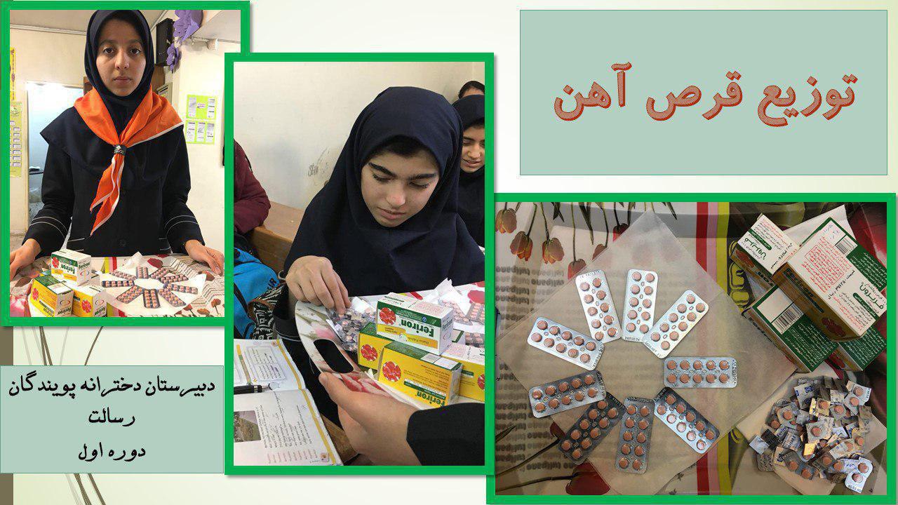 توزیع قرص آهن(طرح سلامت و پیشگیری از کبود آهن در دانش آموزان) به صورت هفتگی هر دوشنبه در مدرسه انجام می گیرد.