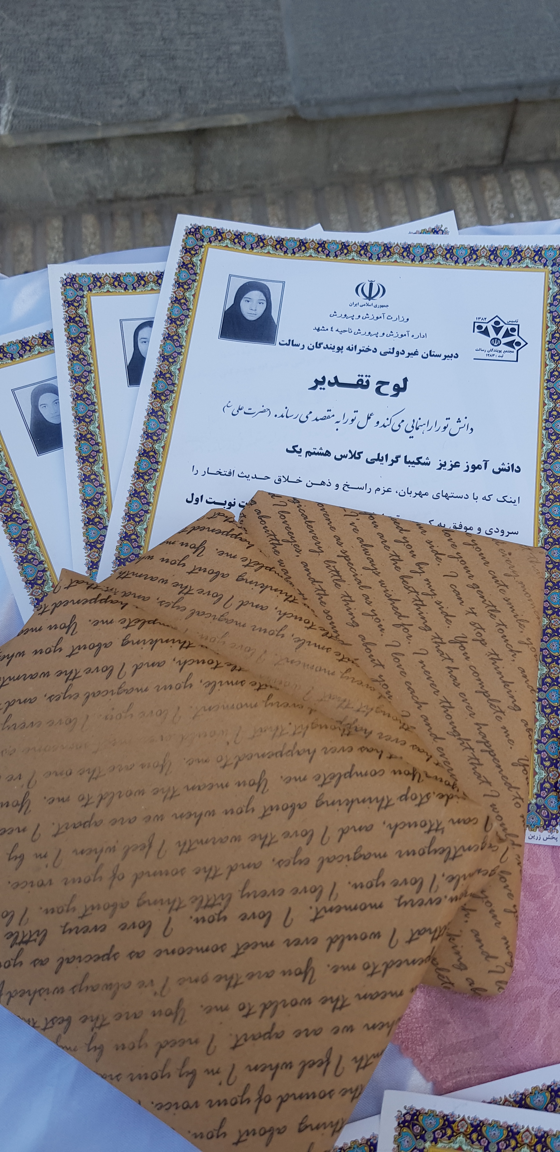 نفرات برتر امتحانات نوبت اول- دانش آموزان راه یافته به مرحله استانی جشنواره خوارزمی (احساس واژه ها و خوارزمی)- دانش آموزان فعال در گروه موسیقی و تئاتر آموزشگاه- دانش آموزان برتر حجاب- دانش آموزان شرکت کننده در نماز- متولدین دی و بهمن ماه